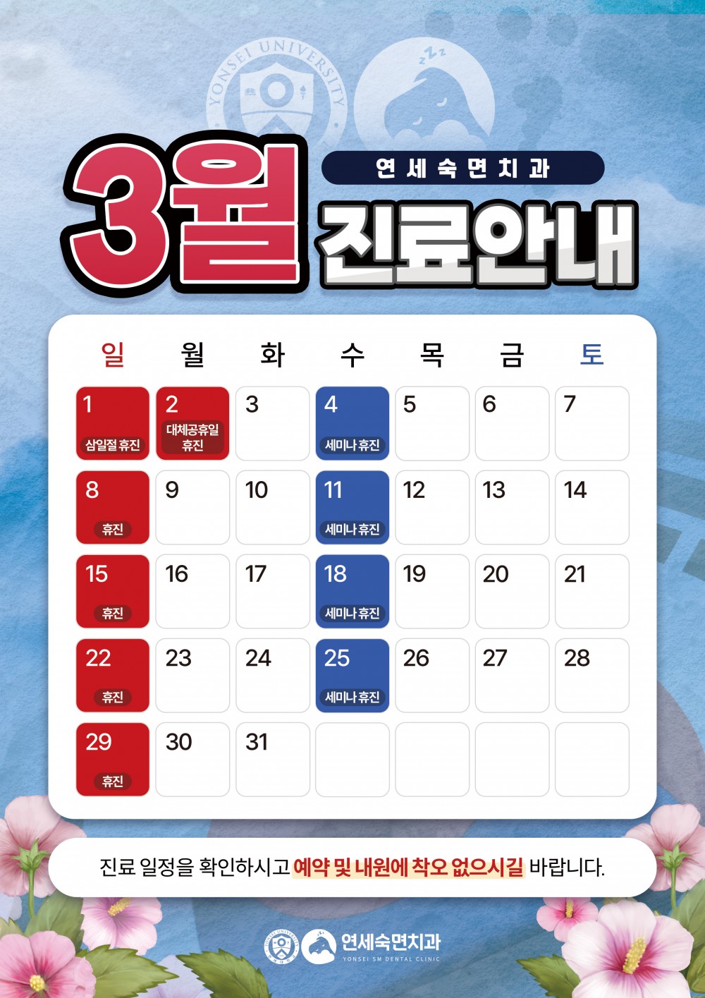 연세숙면치과 3월 진료일정 안내 페이지 정보 작성자 연세숙면치과의원 관련링크 본문 안녕하세요 :) 연세숙면치과 3월 진료일정 안내드립니다. 진료일정을 참고하시어 예약 및 내원에 불편함 없으길 바랍니다. 감사합니다 :)